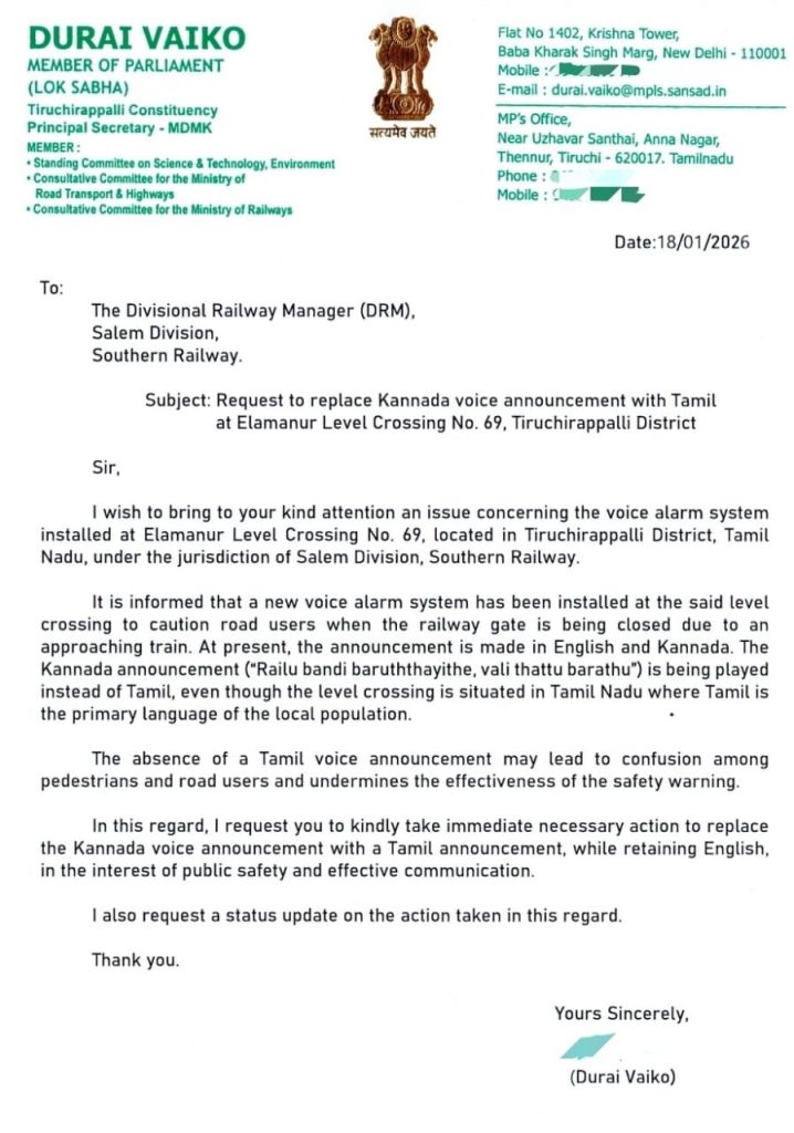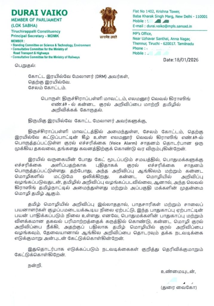தமிழ்நாட்டில் உள்ள எலமனூரில் தமிழில் எச்சரிக்கை செய்தி ஒலிபரப்பு இல்லாத காரணத்தினால் பாதசாரிகள் மற்றும் வாகன ஓட்டிகள் குழப்பம் அடையக்கூடிய நிலை ஏற்பட்டுள்ளதை சுட்டிக்காட்டி சேலம் கோட்ட இரயில்வே மேலாளர் அவர்களுக்கு கடிதம் எழுதியும், அலைபேசி வாயிலாக அழைத்து இதன் விபரங்களையும் அவசரத்தையும் எடுத்துக் கூறி, விரைந்து அதனை சரி செய்ய துரை வைகோ எம்.பி கோரிக்கை கடிதம் எழுதினார்..
