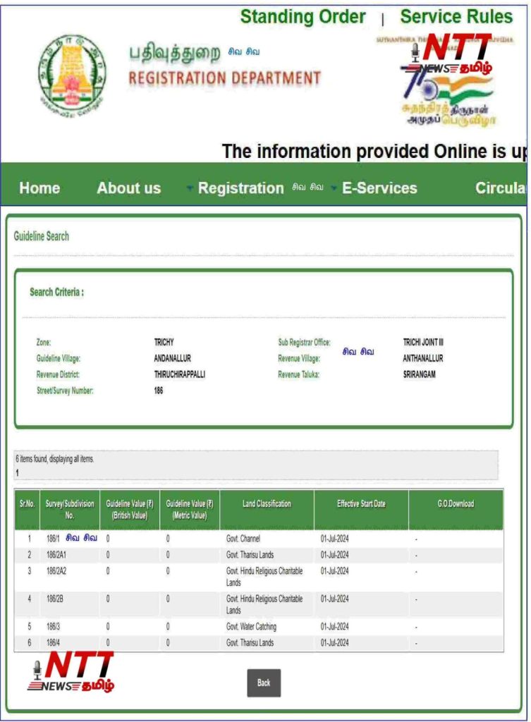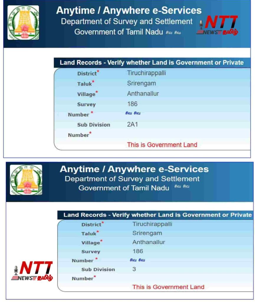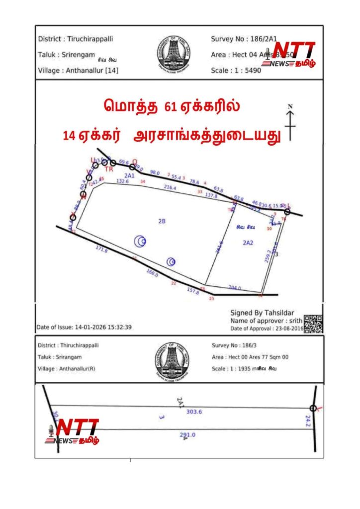 அந்தநல்லூர் வருவாய் கிராமம், சர்வே எண் 186 / 2A1,3 உள்ள கிட்டத்தட்ட 14-ஏக்கர் நிலம் . தமிழக அரசாங்க வலைதளத்தில் இருந்து எடுக்கப்பட்ட வருவாய்த்துறை, பதிவுத்துறை ஆவணங்களின் படி அரசாங்க தரிசு நிலமாக இருக்கிறது. தங்களது உடனடி பார்வைக்கு அந்த ஆவணங்கள் கீழே இணைக்கப்பட்டுள்ளன.