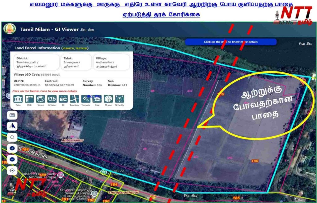 திருவரங்கம் வட்டம் எலமனூரில் வசிக்கும் மக்கள் சார்பாக, இன்று மாவட்ட ஆட்சியரிடம் காவிரி ஆற்றிற்கு குளிக்கப் போவதற்கு பாதை கேட்டு மற்றும் 14 ஏக்கர் அரசாங்க தரிசு நிலத்தை மீட்க கோரிக்கை மனு கொடுக்கப்பட்டது.