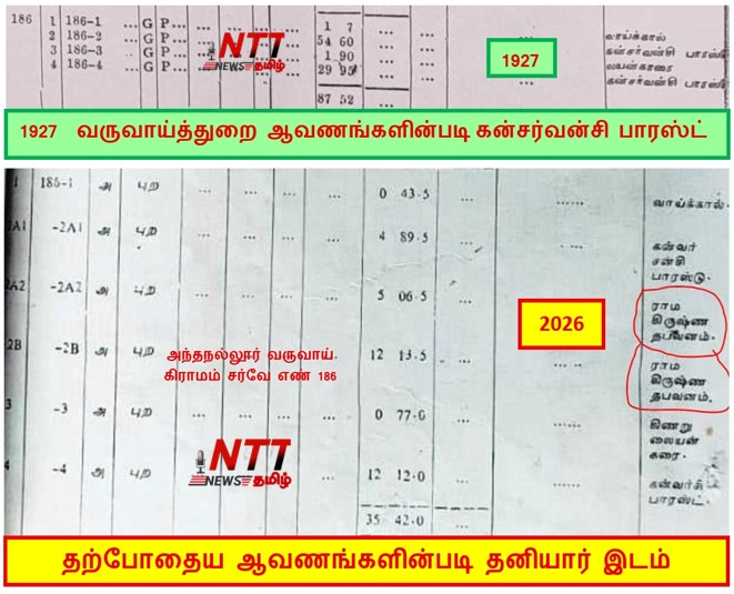 அதேபோல், 1927ஆண்டு, வருவாய்த்துறை ஆவணங்களின் படி திருச்சி மாவட்டம், திருப்பராய்த்துறை வருவாய் கிராமத்தில் சர்வே எண் 175 & 176/2ல் சுடுகாட்டுக்கு என ஒதுக்கப்பட்டுள்ள இடம் மற்றும் சாலை, ஆக்கிரமிப்பு செய்யப்பட்டுள்ளது.