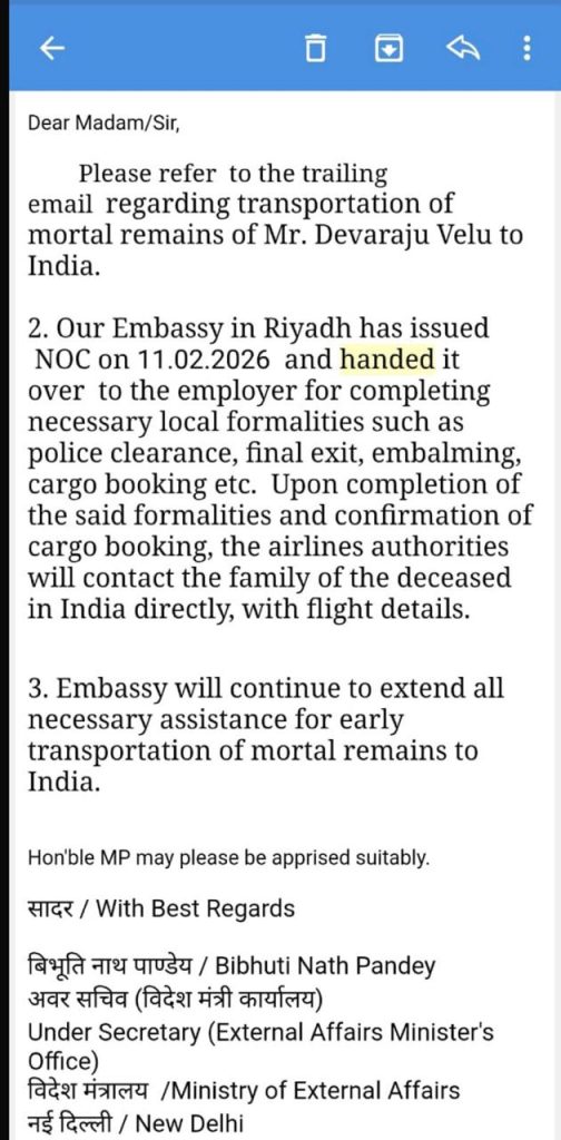 திருச்சி நாடாளுமன்ற தொகுதிக்கு உட்பட்ட புதுக்கோட்டை மாவட்டம் கந்தர்வகோட்டையை சேர்ந்த அயலகத்தில் வேலை செய்து வந்த திரு. தேவராஜ் வேலு அவர்கள் அங்கே திடீரென மரணமடைந்தார். இதையடுத்து அவரது குடும்பத்தினர் கேட்டுக்கொண்டதன் பேரில், அவரது உடலை தாயகம் கொண்டு வர உதவுவதற்காக உடனடியாக வெளியுறவுத்துறை அமைச்சர் திரு. ஜெய்சங்கர் அவர்களின் அலுவலகத்தை தொடர்பு கொண்டு நடவடிக்கை எடுக்குமாறு கேட்டுக்கொண்டார் துரை வைகோ; அதன் தொடர்ச்சியாக ரியாத்தில் உள்ள இந்திய தூதரகம் 11.02.2026 அன்று தேவையான NOC உள்ளிட்ட அனைத்து அனுமதிகளையும் வழங்கி, தொடர்புடைய நடைமுறைகளை மேற்கொண்டதாக வெளியுறவுத்துறை அமைச்சகம் தெரிவித்தது.