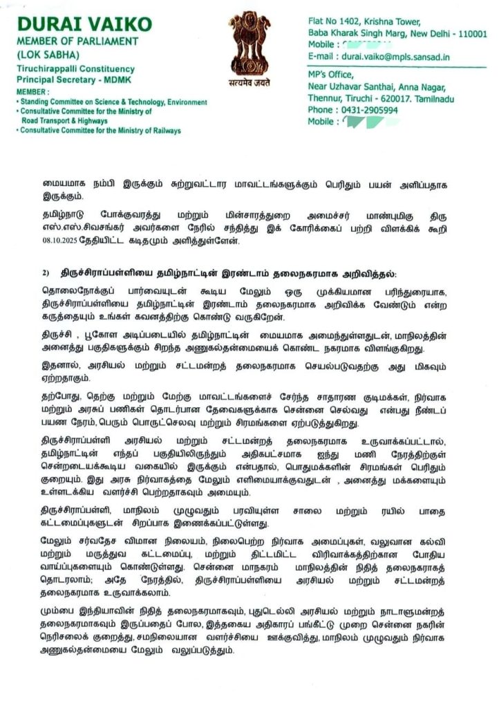 🔹 திருச்சிக்கு மெட்ரோ ரயில் சேவை அமைப்பதில் முன்னுரிமை.