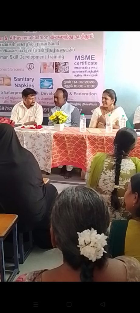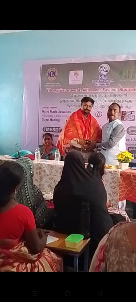 14.02.26 அன்று எஸ்ஆர் அறக்கட்டளை மற்றும் அல் கத்தினா ஃபேஷன் இணைந்து நடத்திய பெண்கள் ஒரு நாள் தொழில் முனைவோர் பயிற்சி சமயபுரம் சாய் ஸ்ரீ வித்யாலயா பள்ளி வளாகத்தில் நடைபெற்றது. இவ்விழாவில் சிறப்பு விருந்தினராக திருச்சி பனானா லீப் ஹோட்டல் குரூப் நிறுவனர் மனோகரன் மற்றும் சமயபுரம் shine LIONS கிளப் தலைவர் R.ராஜா அவர்கள் மற்றும் சமயபுரம் கண்ணனூர் பேரூராட்சி தலைவர் சரவணன் VMS சித்தா கிளினிக் டாக்டர் சுதாசினி SRM மெடிக்கல் கல்லூரி உதவி பேராசிரியர் மாலதி மற்றும் அல்ஹசீனா பேஷன் நிறுவனர் ரஃபியா பேகம் நாநீ ஹெர்பல்ஸ் ரஷீதா SR அறக்கட்டளை நிறுவனர் ராஜசேகரன் ஆகியோர்கள். ஆகியோர்கள் விழாவினை குத்து விளக்கேற்றி துவக்கி வைத்தனர். இவ்விழாவில் 70 பெண்கள் பதிவு பெற்று அதில் 51 பேர் பயிற்சியில் கலந்து கொண்டனர். பயிற்சி முடிவில் அவர்களுக்கு சான்றிதழ் வழங்கப்பட்டது வழங்கப்பட்ட பயிற்சிகள் சானிட்டரி நாப்கின் சோப் தயாரித்தல் மற்றும் ஹேண்ட் மேட் ஜூவல்லர்ஸ் அனைத்தும் சிறப்பான முறையில் பயிற்சி அளித்து அவர்களுக்கு புதிய தொழில் முனைவோர் ஆக ஏற்படுத்தி தர இவ் அறக்கட்டளை செயல்பட்டுள்ளது.