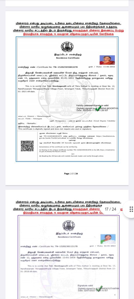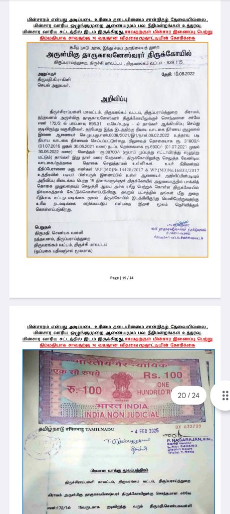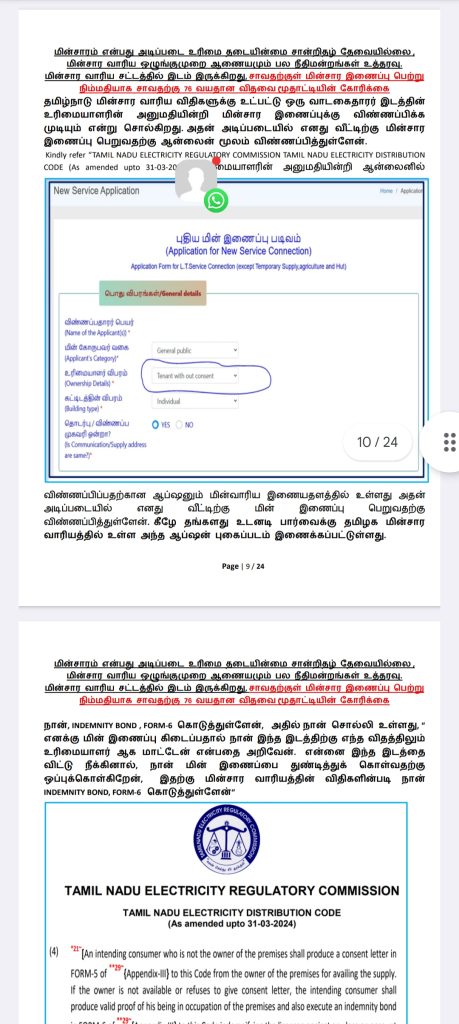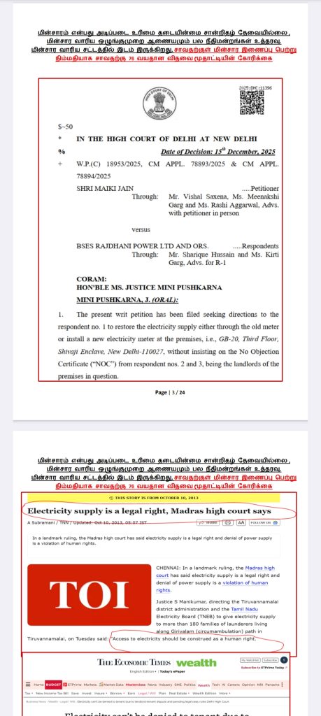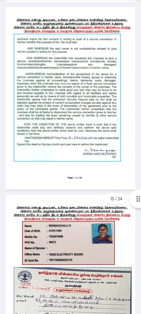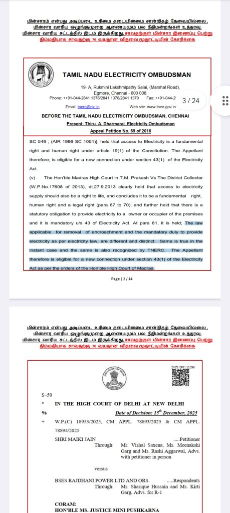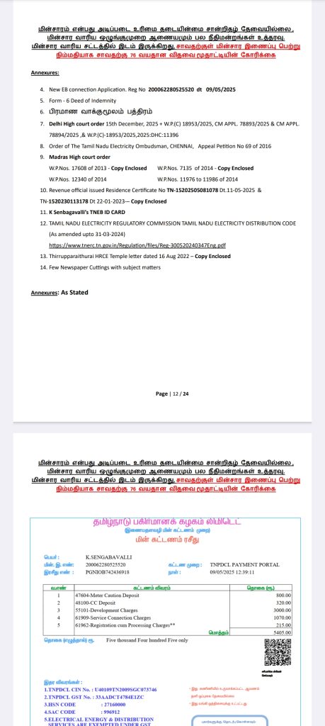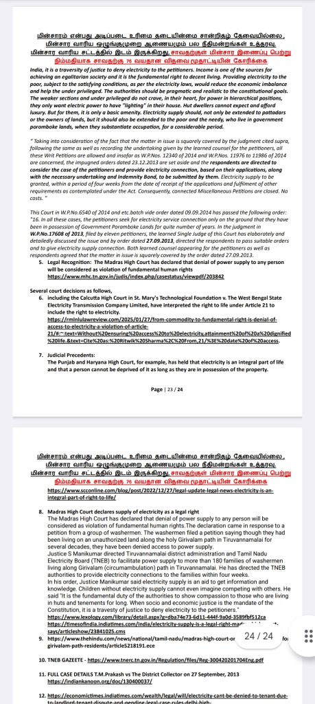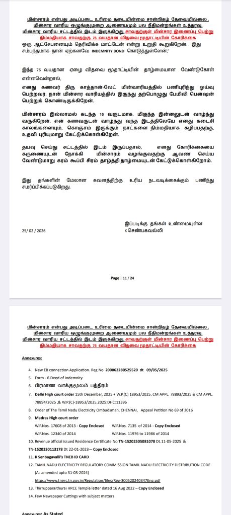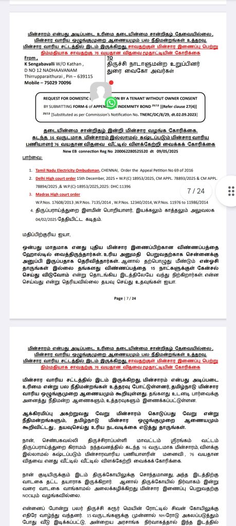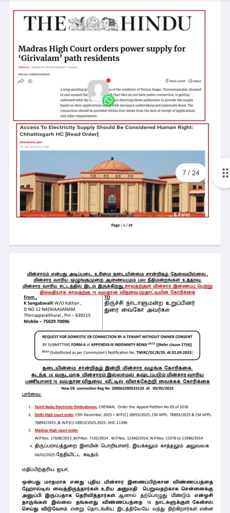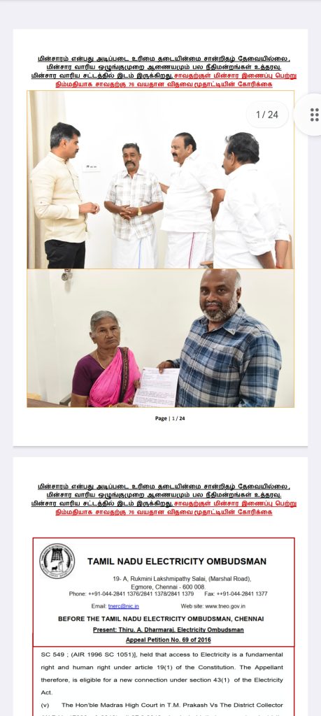 எங்களுக்கு மின்சார வசதி மட்டுமாவது தற்காலிகமாக பெற்றுத் தாருங்கள். இதற்கு மின்சார வாரிய சட்டத்தில் இடம் இருக்கிறது. மின்சாரம் என்பது அடிப்படை உரிமை என்று நமது பல நீதிமன்றங்களும் உத்தரவு போட்டுள்ளன. எங்களது மனுவை என்ஓசி கேட்டு நிராகரிப்பதிலேயே மின்சார வாரியம் குறியாக இருக்கிறது.