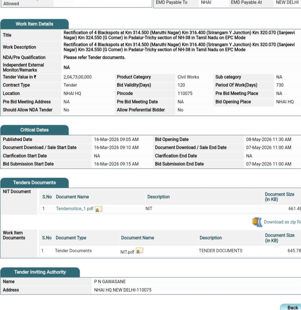 திருச்சி நாடாளுமன்ற தொகுதிக்கு உட்பட்ட திருச்சி – சென்னை தேசிய நெடுஞ்சாலை 38ல், G Corner மட்டுமல்லாமல் இதே சாலையில், பல உயிர் பலிகள் ஏற்பட்டு வந்த மற்ற முக்கிய கருப்பு மையங்களான (Black Spots) சஞ்சீவி நகர், Y Junction மற்றும் மாருதி நகர் பகுதிகளிலும் Vehicular Underpass அமைப்பதற்காக தேசிய நெடுஞ்சாலை ஆணையம் கடந்த 14.03.2026 அன்று நான்கு திட்டங்களுக்கும் சேர்த்து சுமார் ₹ 205 கோடிக்கு ஒப்பந்தப்புள்ளி (Tender) கோரியுள்ளது.