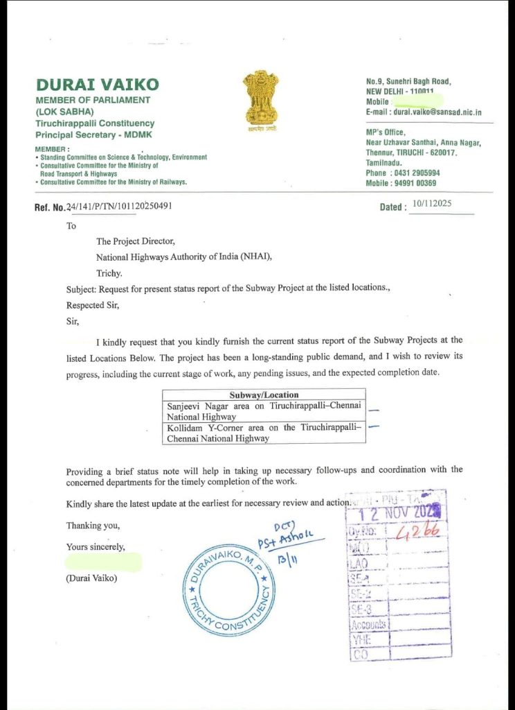 இது தொடர்பாக கடந்த 10.11.2025 அன்று இந்த திட்டத்தின் நிலை தொடர்பாக தகவல் அளிக்குமாறு தேசிய நெடுஞ்சாலை ஆணையத்தின் திருச்சி திட்ட இயக்குநர் அவர்களுக்கு கடிதம் எழுதினார் துரை வைகோ எம்.பி. அதற்கு பதிலளிக்கும் வகையில் 24.11.2025 அன்று தேசிய நெடுஞ்சாலை ஆணையத்தால் கொடுக்கப்பட்ட தகவலில் திட்டம் ஏற்கனவே அனுமதிக்கப்பட்டும் திட்ட மதிப்பீடு உட்பட அனைத்தும் முடிக்கப்பட்டு டெண்டர் நடைமுறை அனுமதிக்காக அனுப்பப்பட்டுள்ளதாக தெரிவிக்கப்பட்டது, இது தொடர்பாக கடந்த 24.01.2026 அன்று மாண்புமிகு சாலை போக்குவரத்து மற்றும் நெடுஞ்சாலைத்துறை அமைச்சர் திரு. நிதின் கட்கரி அவர்களுக்கு மின்னஞ்சல் வழியாகவும், 06.02.2026 அன்று மாண்புமிகு சாலை போக்குவரத்து மற்றும் நெடுஞ்சாலைத்துறை இணை அமைச்சர் திரு. ஹர்ஷ் மல்ஹோத்ரா அவர்களை நேரில் சந்தித்து மூன்று மாதங்களாக இந்த நிலையே நீடிப்பதாக எடுத்துக் கூறி டெண்டர் அறிவிப்பை விரைவு படுத்தி வெளியிட கேட்டு கொண்டார் துரை வைகோ. அதை தொடர்ந்து தற்போது டெண்டர் அறிவிக்கப்பட்டுள்ளது.
