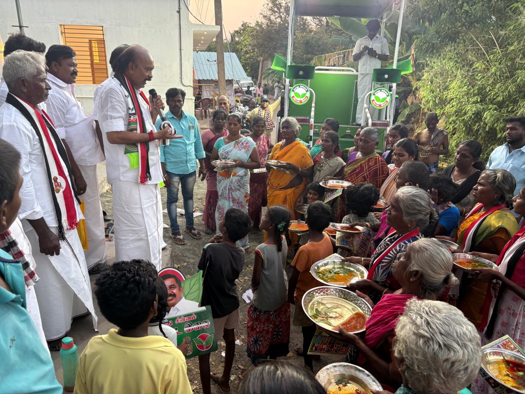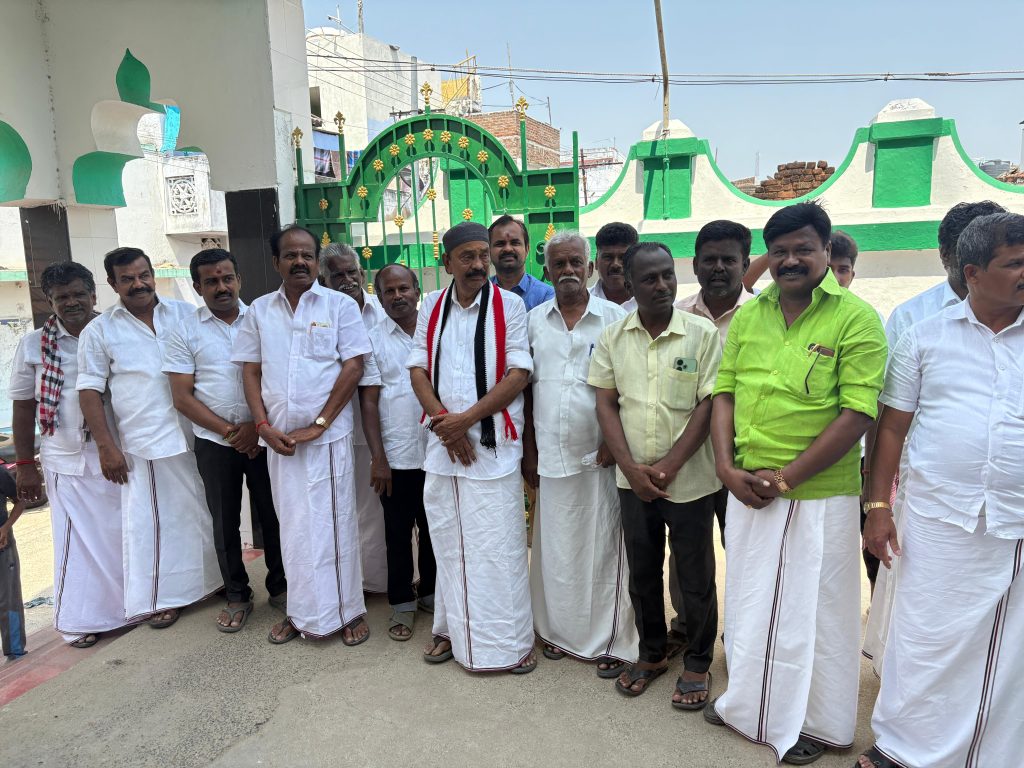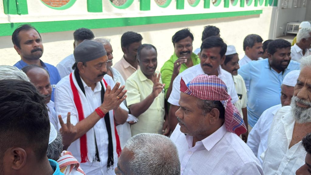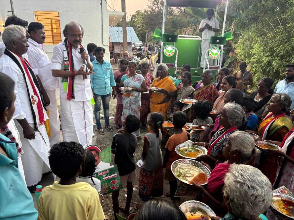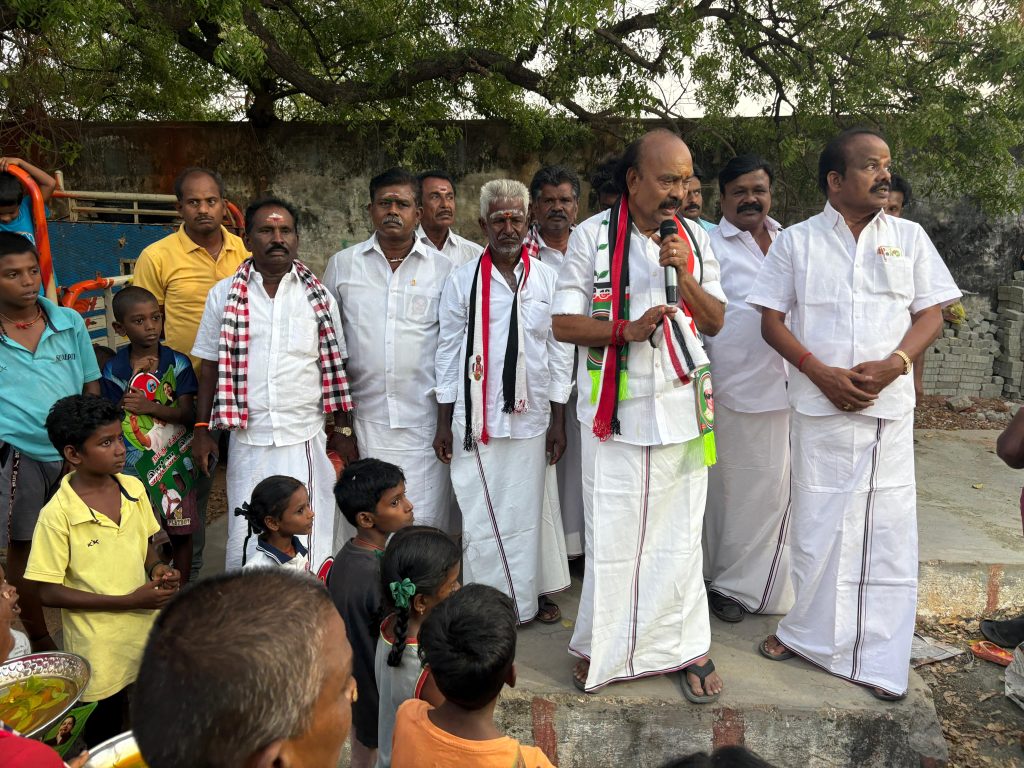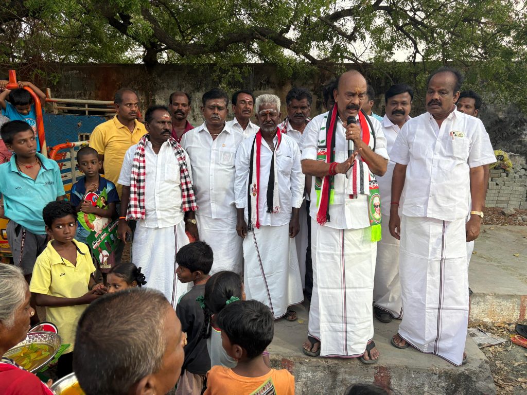 ஆர். மனோகரன் கொளுத்தும் வெயிலையும் பொருட்படுத்தாமல் கிராமம் கிராமமாக சென்று, வீதி வீதியாக வீடு வீடாக வாக்கு சேகரித்து வருகிறார்.